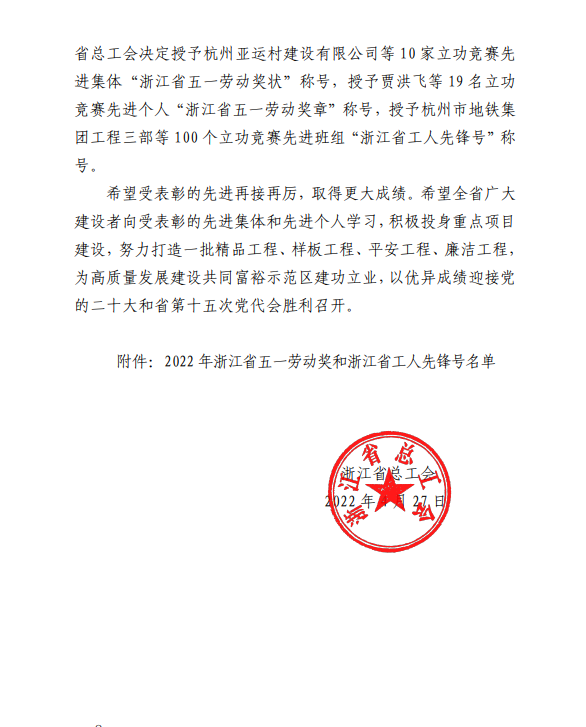 4月27日,我司新建浙江麗水機(jī)場(第一批)02 標(biāo)段項(xiàng)目部榮獲“浙江省工人先鋒號(hào)”稱號(hào)。