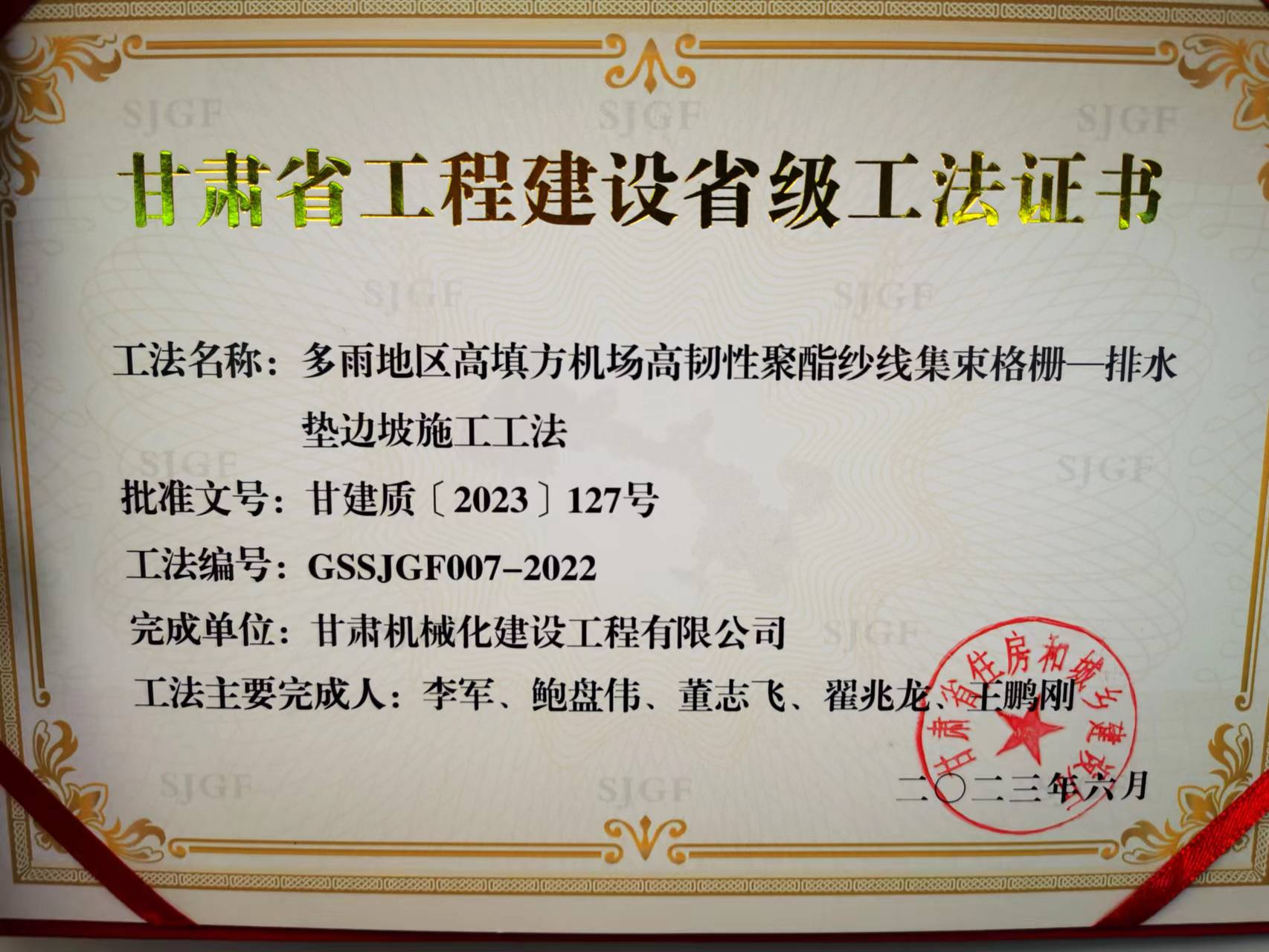 近日,甘肅省住房和城鄉(xiāng)建設(shè)廳頒發(fā)省級工法證書,我司獲得省級工法榮譽。
