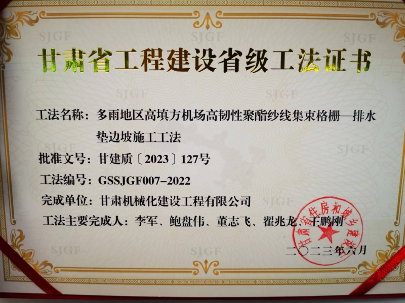 近年來,我司不斷加強技術(shù)創(chuàng)新和精品工程創(chuàng)建,科技創(chuàng)新能力和工藝水平再上新臺階。在承建的麗水機場土石方工程02標(biāo)段中,面對多雨地區(qū)高填方施工中的重難點,公司專門組建了科研和施工小組,通過大量現(xiàn)場工藝實踐、工藝改善,提煉出項目重難點的關(guān)鍵技術(shù)。2023年6月,獲得了“多雨地區(qū)高填方機場高韌性聚酯紗線集束格柵—排水墊邊坡施工工法”。