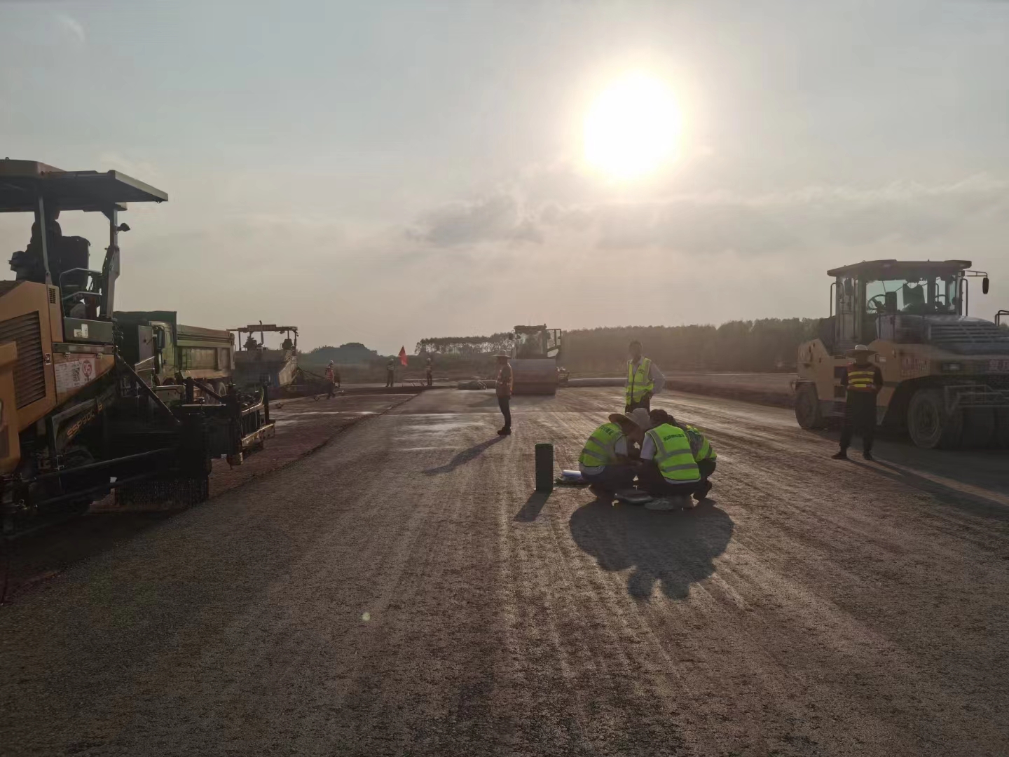 為確保試驗(yàn)段攤鋪設(shè)備工作高質(zhì)、高效進(jìn)行,項(xiàng)目部統(tǒng)一部署,各部門(mén)相互配合,認(rèn)真進(jìn)行施工前各項(xiàng)準(zhǔn)備工作,提前對(duì)有關(guān)人員進(jìn)行安全培訓(xùn)和技術(shù)交底。施工現(xiàn)場(chǎng)井然有序,項(xiàng)目負(fù)責(zé)人嚴(yán)格把控運(yùn)輸、攤鋪、碾壓、檢測(cè)等各施工環(huán)節(jié),保證施工質(zhì)量與安全,同時(shí)對(duì)試驗(yàn)段標(biāo)高、壓實(shí)度、平整度和厚度等各項(xiàng)指標(biāo)進(jìn)行實(shí)時(shí)檢測(cè)并記錄,確保各項(xiàng)指標(biāo)符合技術(shù)規(guī)范要求,并確定水穩(wěn)層松鋪系數(shù)、壓路機(jī)最佳碾壓遍數(shù)及速率,最終達(dá)到預(yù)期試驗(yàn)效果。