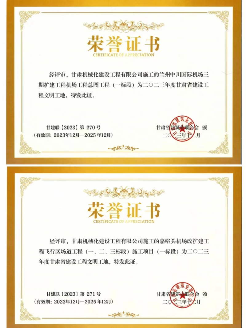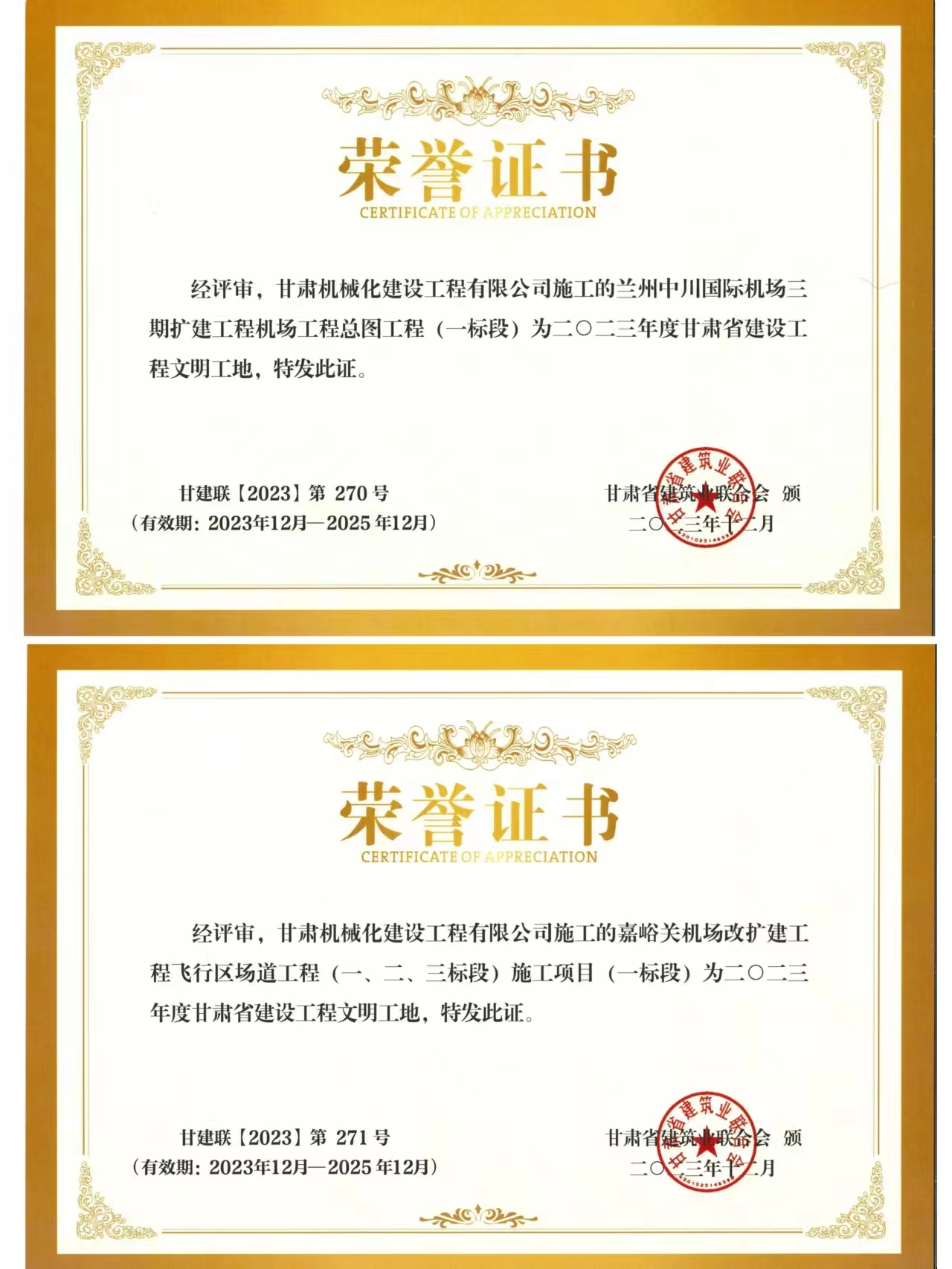 近日,我司承建的蘭州中川國際機場二期擴建工程機場工程總圖工程 (一標段)與嘉峪關機場改擴建工飛行區(qū)場道(一、二、三標段) 施工項目 (一標段) 獲得2023年度甘肅省建設工程文明工地榮譽稱號。